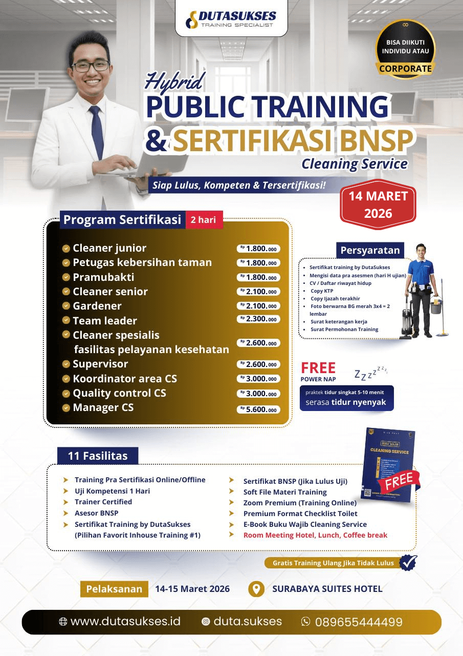 “Pelayanan tim DutaSukses sangat profesional mulai dari pra-training sampai evaluasi akhir. Sertifikasi BNSP-nya juga prosesnya cepat dan transparan.”